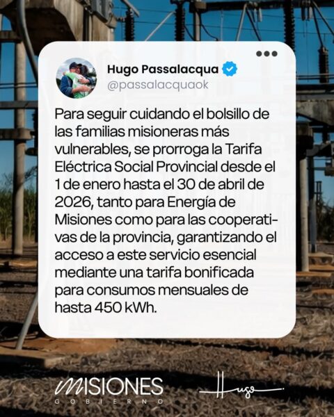 El Gobierno de Misiones prorrogó la Tarifa Eléctrica Social Provincial desde el 1 de enero hasta el 30 de abril de 2026. La medida alcanza a usuarios de Energía de Misiones y de...