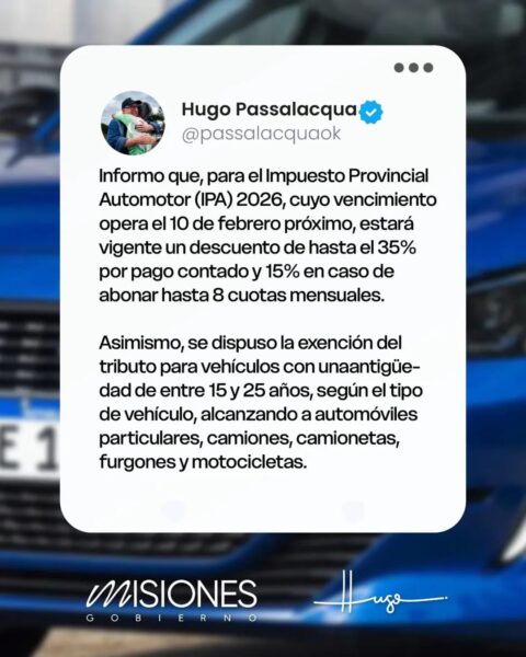 El gobernador de Misiones confirmó importantes beneficios para el Impuesto Provincial Automotor 2026, con bonificaciones por pago contado o en cuotas y la exención según la...