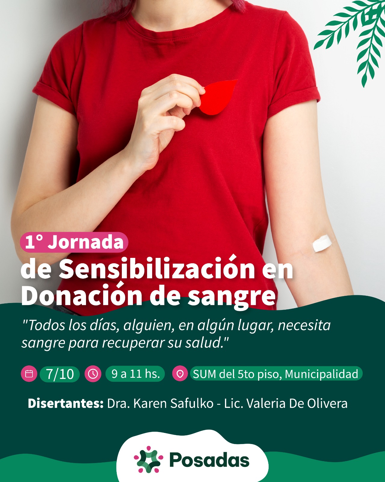 El lunes 7 de octubre, la Municipalidad de Posadas llevará a cabo la 1ª Jornada de Sensibilización en Donación de Sangre. Este evento se desarrollará de 9 a 11 h en el SUM del 5to piso del edificio central, y busca concientizar a la comunidad sobre la importancia de este acto solidario